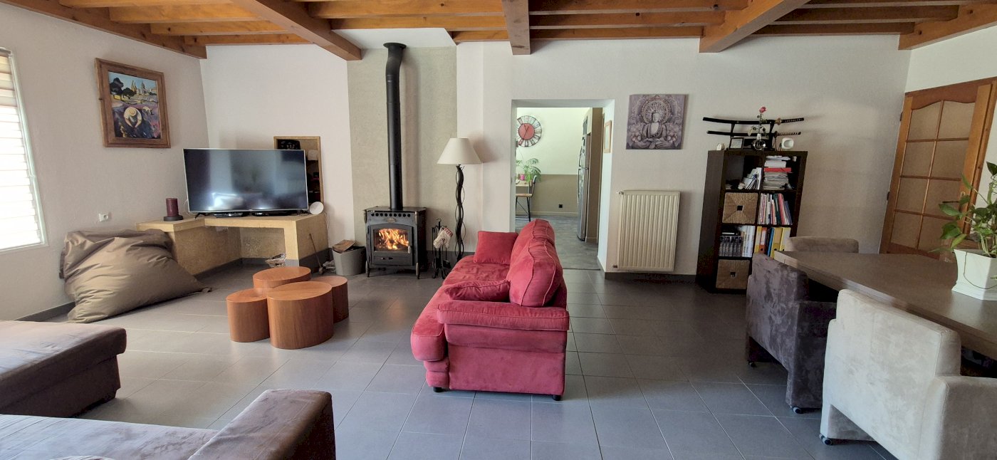 Une pièce de vie de 47 m² avec poêle à bois,