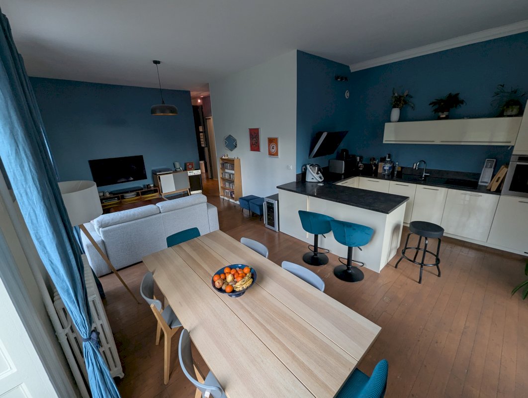 La hauteur sous plafond de 3,20 mètres et les grandes fenêtres amplifient la luminosité et le volume, créant une atmosphère chaleureuse et conviviale.