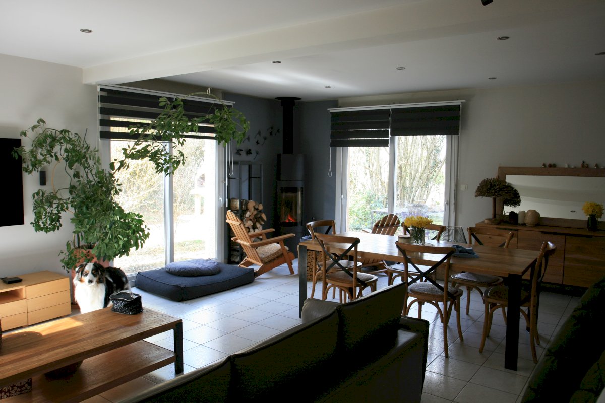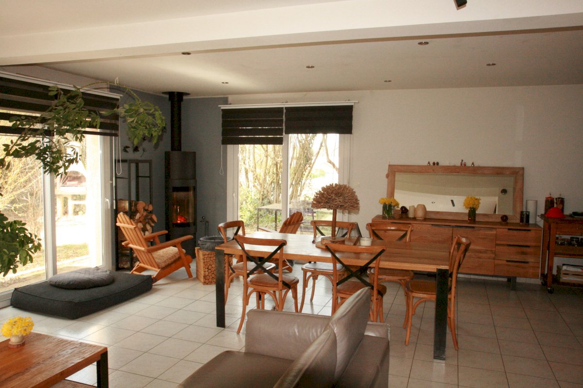 * Cuisine ouverte sur salon / salle à manger équipée d'un poêle à bois orientable (HARRY LANDERS)