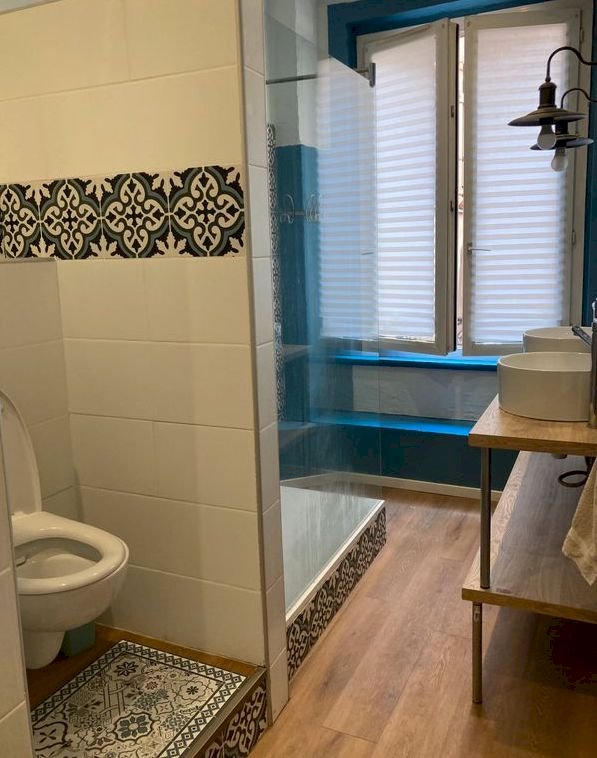 2 salles de bains rénovées en 2022 et 2024 – douche à l’italienne, double vasque et vasque simple, carrelage façon grès cerame et zellige – deux vrais espaces détente à domicile !
