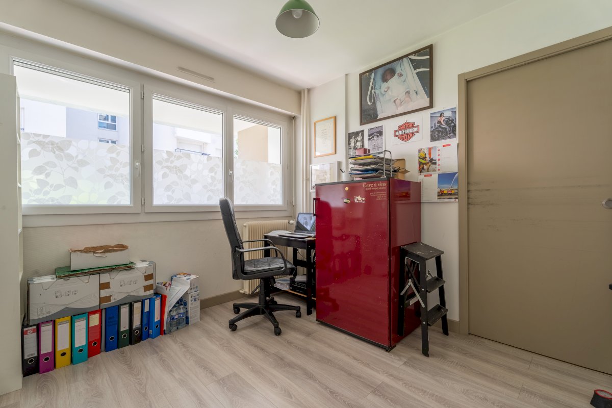 L'appartement orienté Sud/Nord se compose d'une entrée avec placard, d'une cuisine récemment équipée (lave-vaisselle, frigo, four & plaques vitro, lave-linge), 2 chambres, 1 bureau (possibilité 3ème chambre), couloir avec grand placard, d'une salle de bain et d'un WC indépendant. Interphone. Cave de 6m² fermée et sécurisé en sous-sol. Porte d'entrée blindée 5 points. Grand parking fermé avec possibilité de garer 2 à 3 voitures. Possibilité de reprendre location garage 90€/mois.