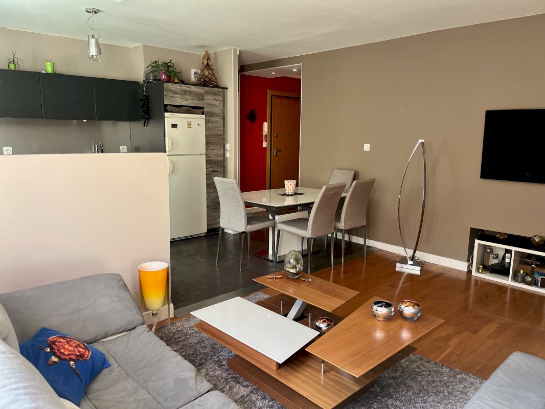 L’entrée équipée de rangements ouvre sur un grand séjour orienté plein sud avec cuisine entièrement équipée ouverte.